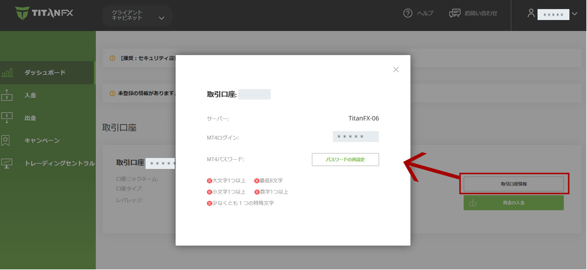 ⑩[取引口座情報]をクリックすると、MT4のログイン情報が出てきます。
