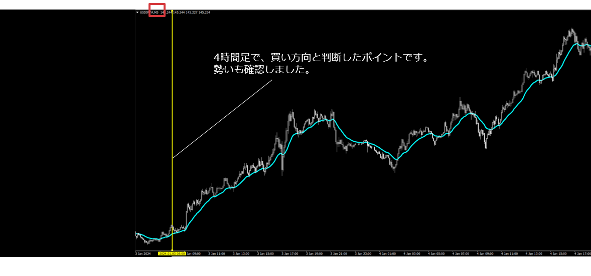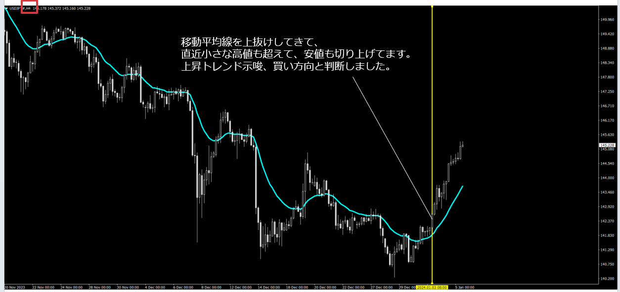 移動平均線の下にローソク足があったのに、上に乗っかってきた。→買い方向