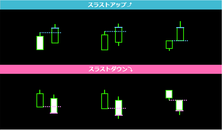 スラスト形状のローソク足は、相場が強いことを示唆する形状です。