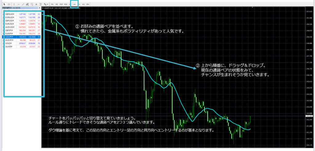 【5分足】エントリーしてる場合、【1時間足】で方向性がはっきりしている通貨を選びます。